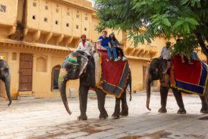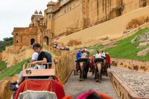 The next stop was the Amber Fort where we were dropped at the loading area for the elephant ride up to the fort. Despite all of the warning signs about tipping, the elephant driver will probably request some small tip (100 is fine). There are a lot of hawkers trying to get your attention to buy hats and other things, but the most irritating part is the photographers along the way. These photographers will snap your photo and then try to sell it to you at the other end. We were quite successful in not looking at any of them, so we managed to avoid these people. The ride is 1100 per elephant if it was not already included in your package.