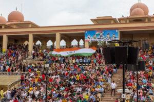 It was sort of like looking into a mirror on the opposite side of the border, but the other side was considerably quieter and smaller. The Punjabi and Hindi music was pumping out of huge loud-speakers on the Indian side with one of the border patrol people acting as an emcee getting the crowd more and more pumped up with excitement. The crowd had maybe a 2000 people today on our side of the border but a much smaller crowd on the other side. What I found online suggested that the crowd could be 20,000 but there is no way you could fit that many in. You could feel the excitement in the air as the huge India flag was passed around from one end of the stadium to the other and of course eventually the song Jai Ho played and at this point you can get a sense of how much pride the Indians have for their country.